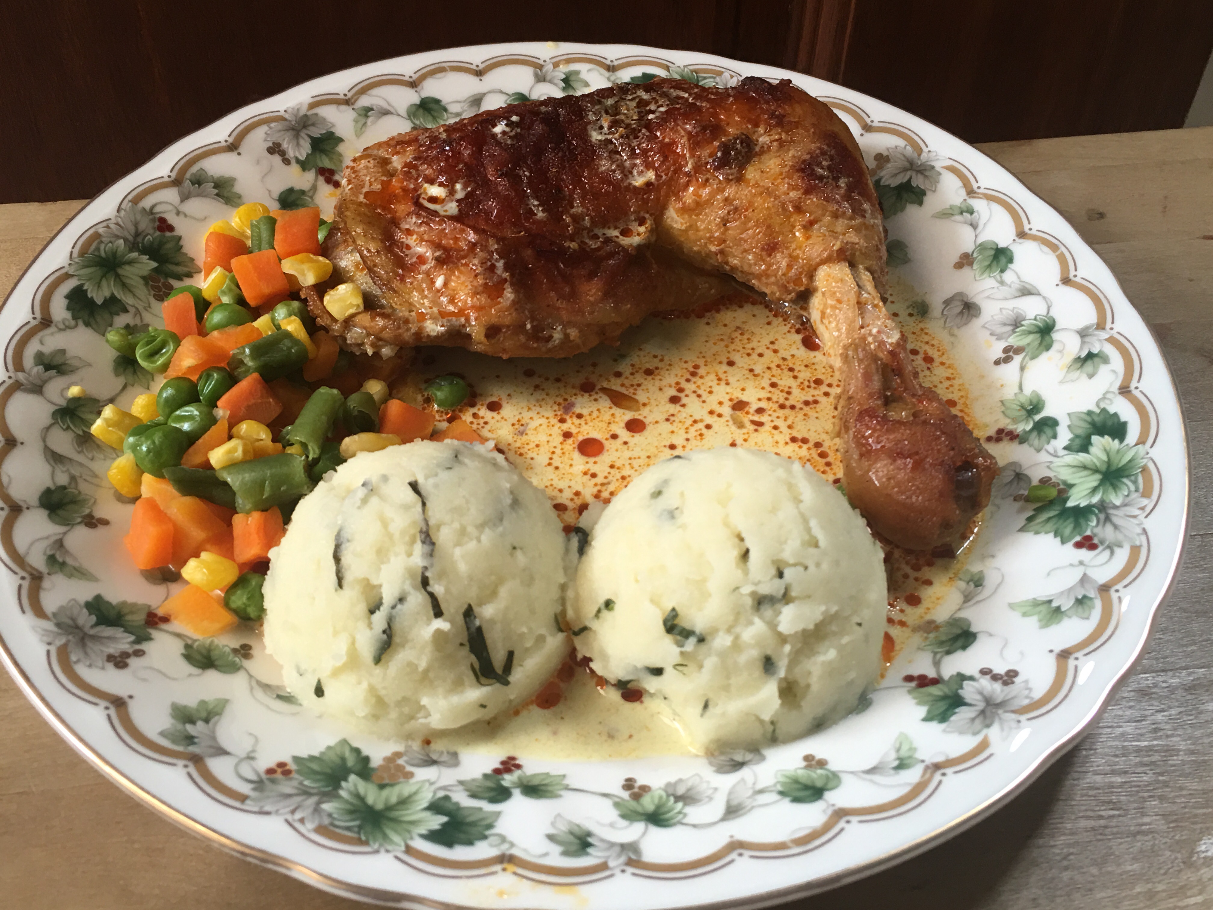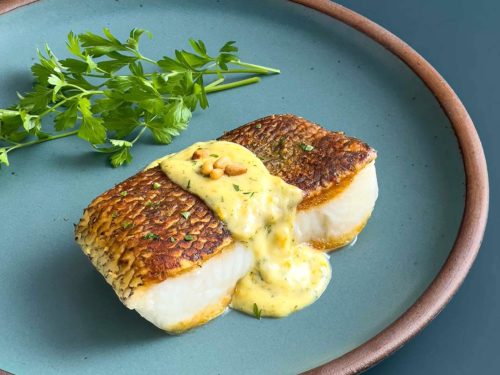 With citrus beurre blanc, served with roasted vegetables and mashed potatoes.